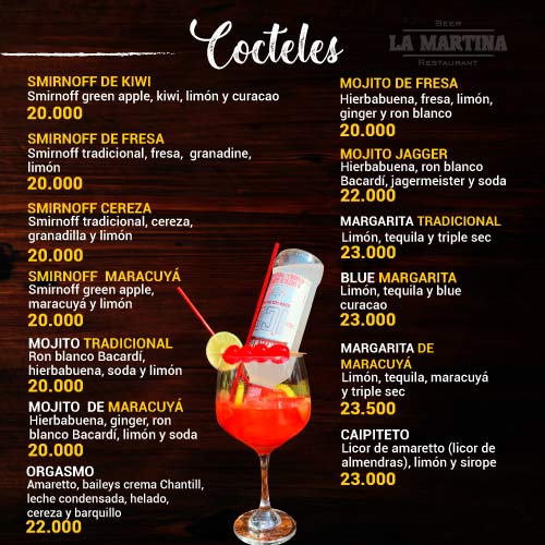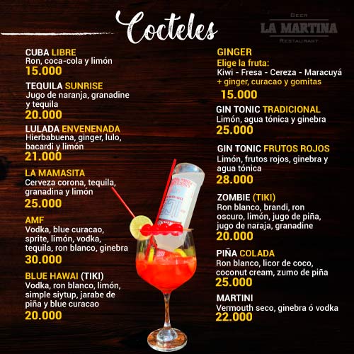 Licores: Aguardiente Antioqueño, Ron de Caldas, Buchanans 12 años, Old Parr 12 años, Jack Daniels 12 años, Johonny Walker Sello Rojo