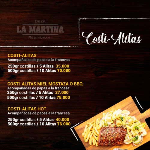 Costillas BBQ, Costillas Miel Mostaza, Costillas Hot.