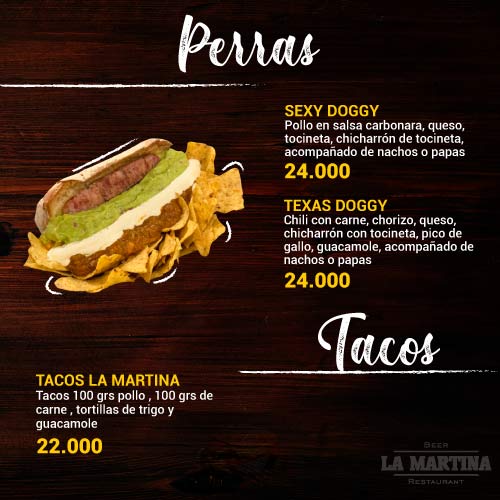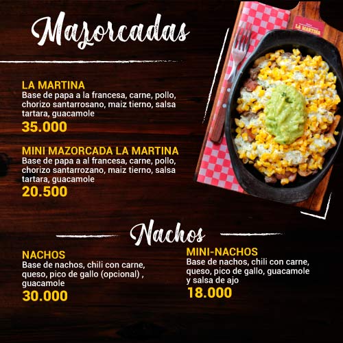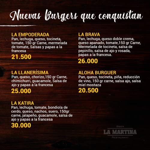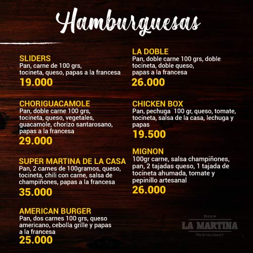 Hamburguesas: Slider, Choriguacamole, Súper Martina de la Casa, American Burger, La Doble.