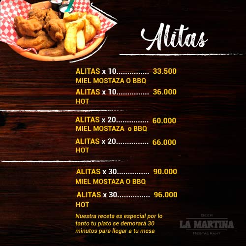 Alitas BBQ, Alitas Miel Mostaza, Alitas Hot.
