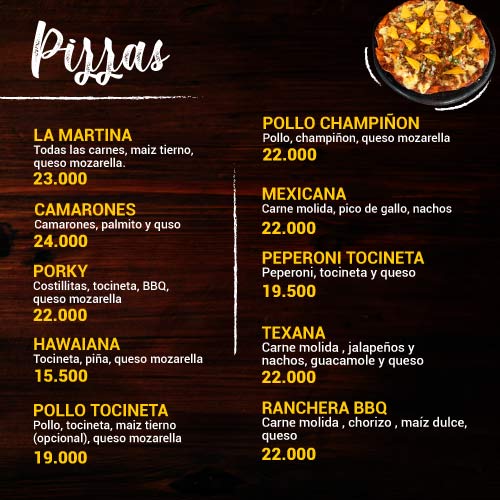 Nuestras Pizzas te deleitarán, La Martina, Camarones, Porky, Hawaiana, Pollo tocineta, Mexicana, Pollo Champiñón.