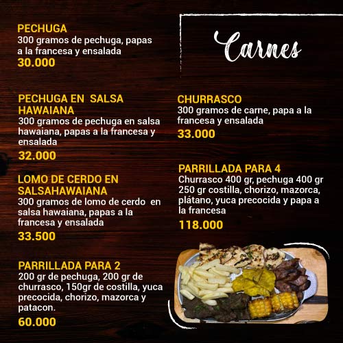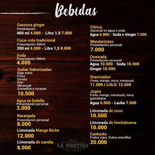 Bebidas: Gaseosas, Coca-Cola, Ginger, Sodas Saborizadas, Agua, Naranjada y Limonada.