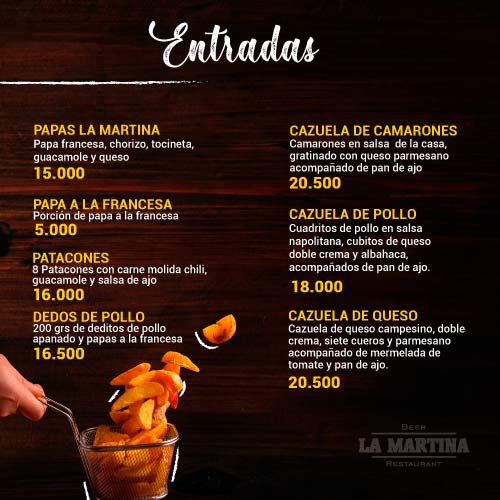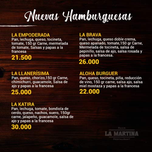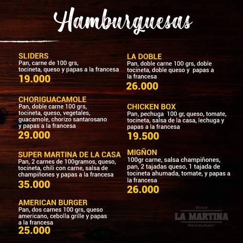Hamburguesas: Slider, Choriguacamole, Súper Martina de la Casa, American Burger, La Doble.