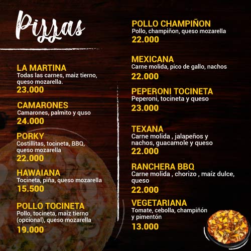 Nuestras Pizzas te deleitarán, La Martina, Camarones, Porky, Hawaiana, Pollo tocineta, Mexicana, Pollo Champiñón.