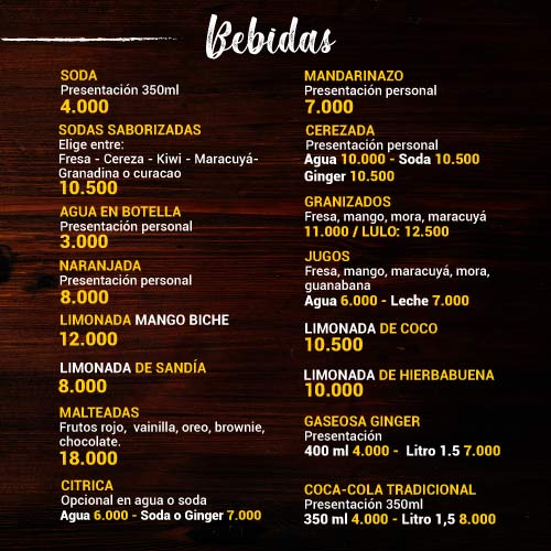 Bebidas: Gaseosas, Coca-Cola, Ginger, Sodas Saborizadas, Agua, Naranjada y Limonada.